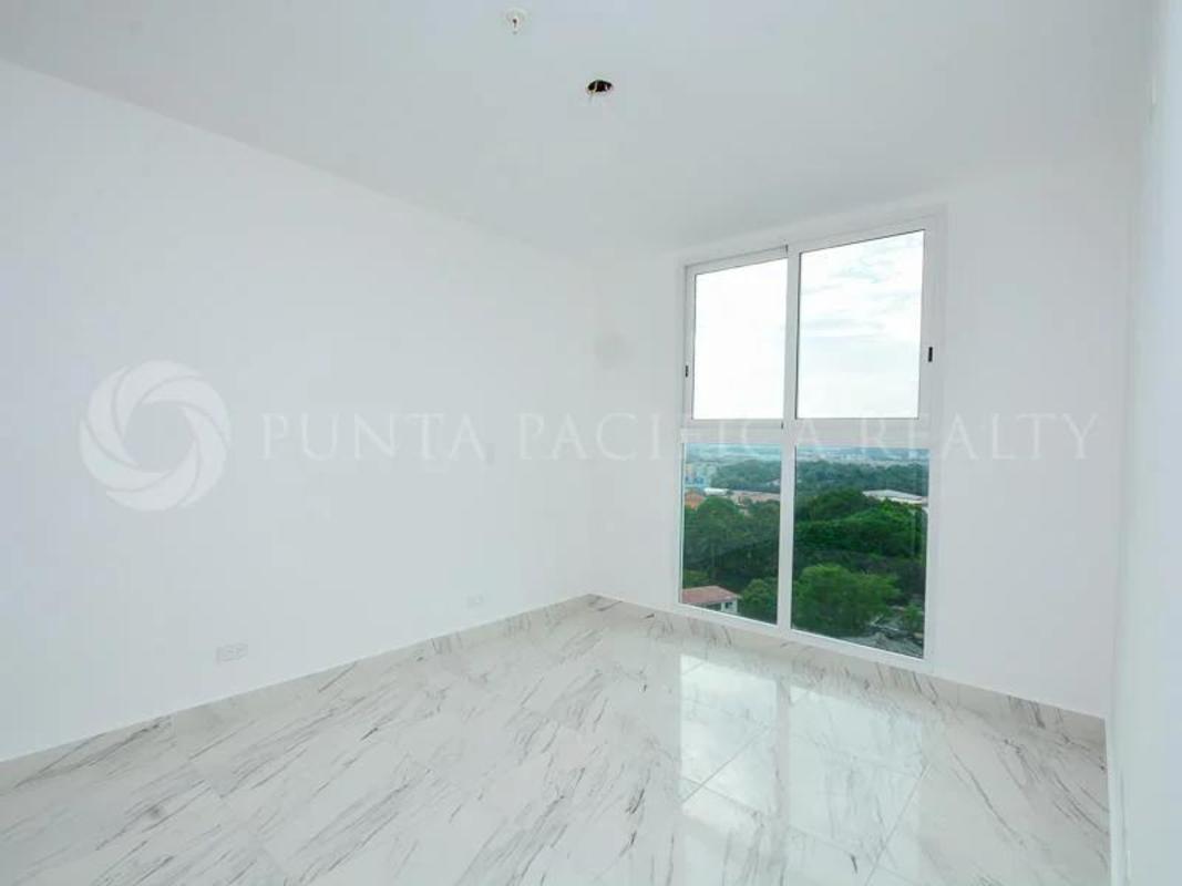 Bright bedroom with floor-to-ceiling window offering city and green views at PH El Botánico Bella Vista Panama