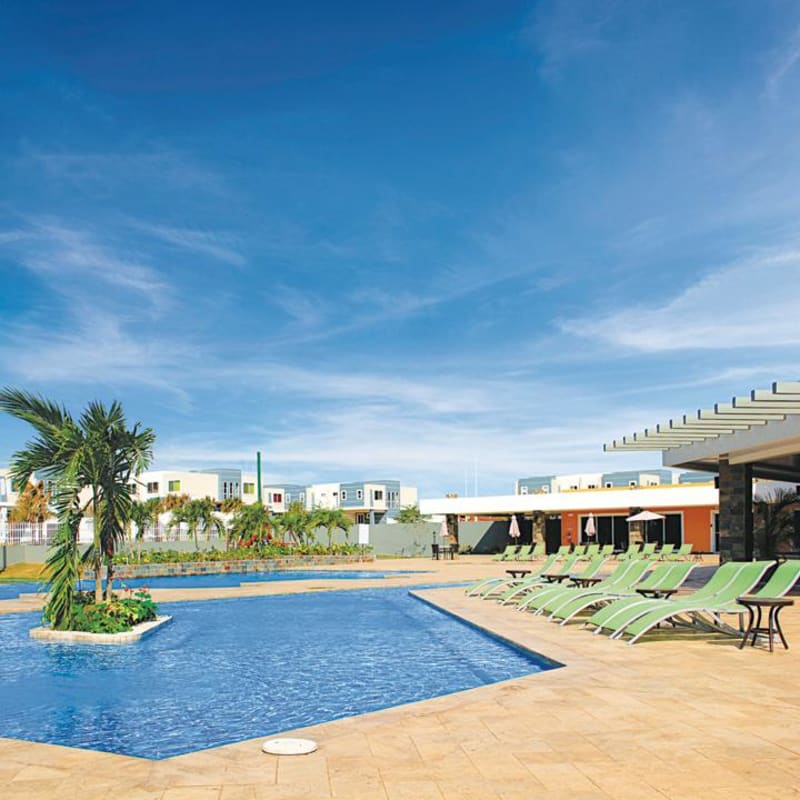 Gated community swimming pool with lounge chairs in PH Alpes Brisas del Golf Panama City