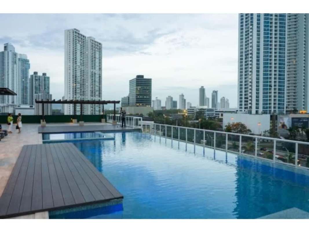 Rooftop pool with panoramic views of the skyline and ocean.