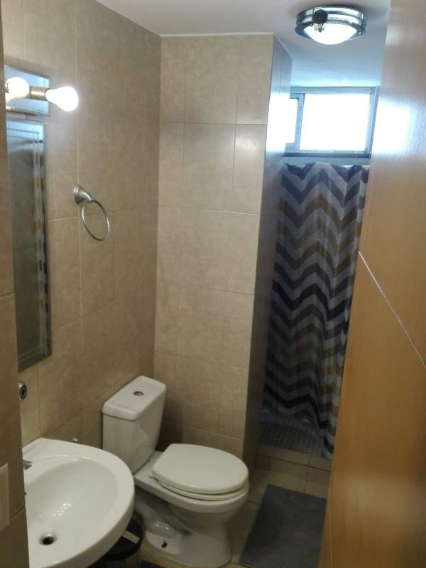 Modern bathroom with beige tiles, ceramic sink, toilet and walk-in shower at PH La Loma Hato Pintado Panama City