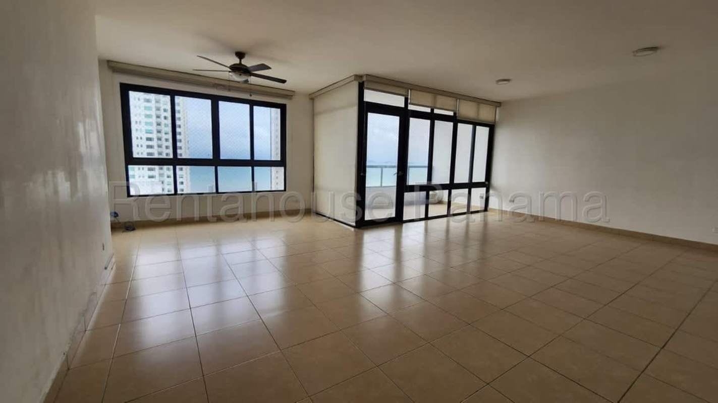 Spacious balcony with glass railing, safety net, overlooking ocean and skyline in Costa del Este Panama