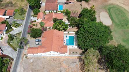 Exterior Aerial: Elegant villa with red tile roof, lush gardens and pool in Coronado Golf Resort Panama