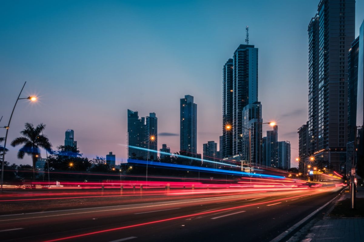 Hotel building exterior in Obarrio with dusk city skyline and light trails Panama City