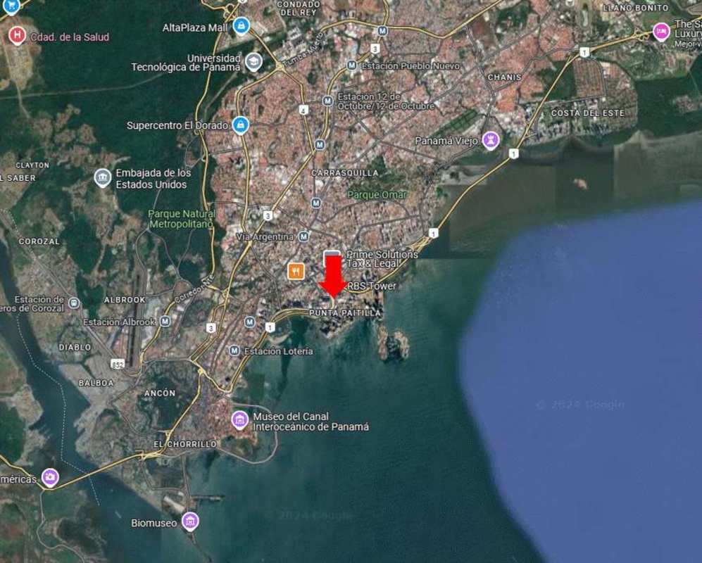 Satellite view indicating prime location of RBS Tower near coastline Punta Paitilla Panama City