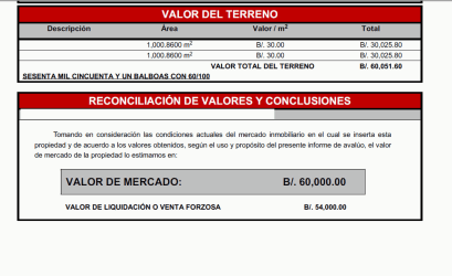 Document: Detailed land valuation showing market and forced sale value in Coclé.