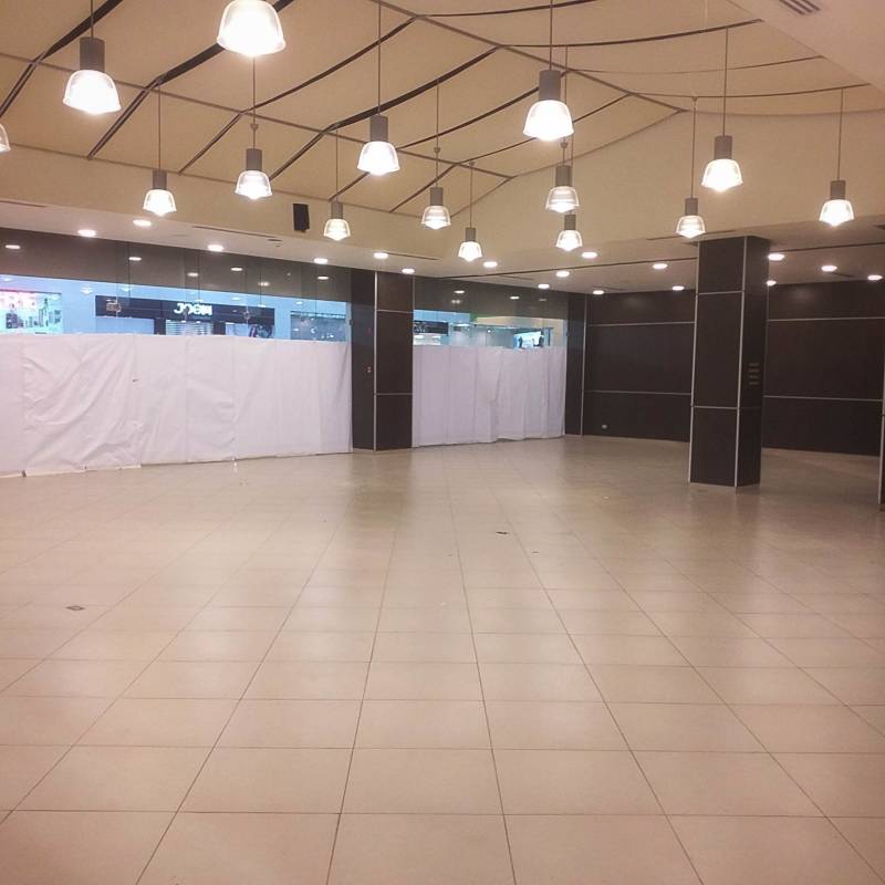 Empty modern commercial retail space with tile floors, mirrored wall and lighting at Albrook Mall Panama