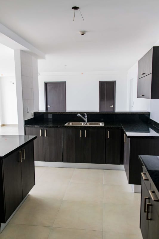 Spacious kitchen with granite countertops, dark cabinets, porcelain tile floors in Altos Tower Condado del Rey