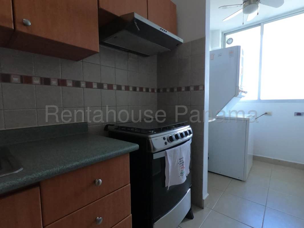 Contemporary kitchen with tile backsplash, wooden cabinets, gas stove, and laundry in PH Green Bay Costa del Este Panama