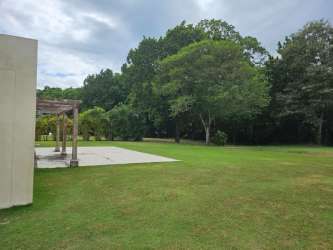 Spacious backyard with mature trees, patio, pergola and lush lawn at Villas Royal Decameron Rio Hato