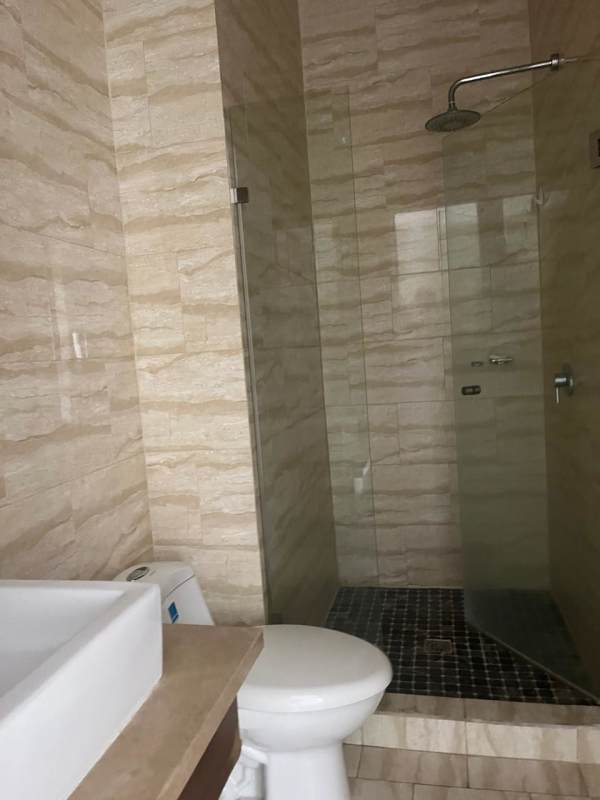 Modern bathroom with beige tiles, glass enclosure, sleek vanity in PH Denovo Bella Vista Panama