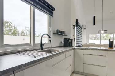 Bright kitchen with modern countertops, cabinetry, and large window in San Carlos beach home