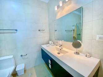 Contemporary bathroom with mirror, granite countertop vanity, tiled walls in beachfront condo Santa Clara Panama