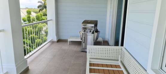 Balcony: Wide covered terrace perfect for relaxing with pool and clubhouse views.