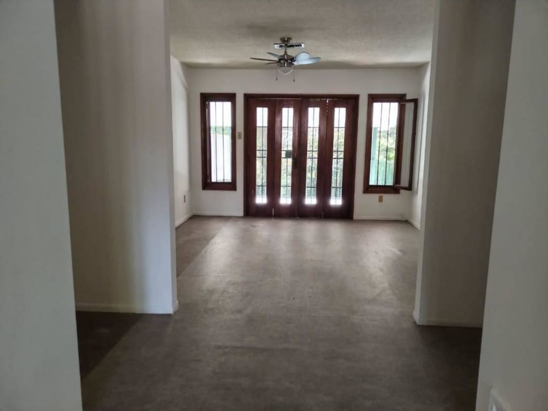 • large wood-trimmed windows with security bars