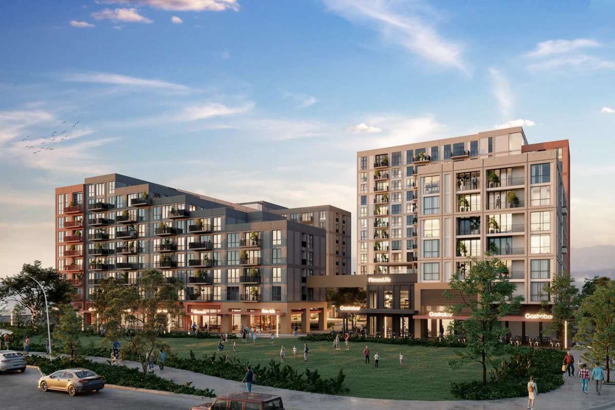 Exterior: Centriqo tower featuring balconies, retail spaces and vibrant public plaza.