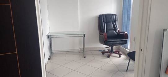 Bright modern office with glass desk, tiled floor, large window in Plaza Oeste La Chorrera