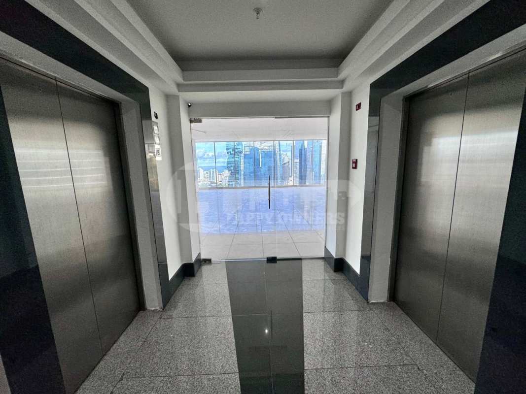 Modern lobby with stainless elevators and city view at PH SL55 Obarrio Panama City