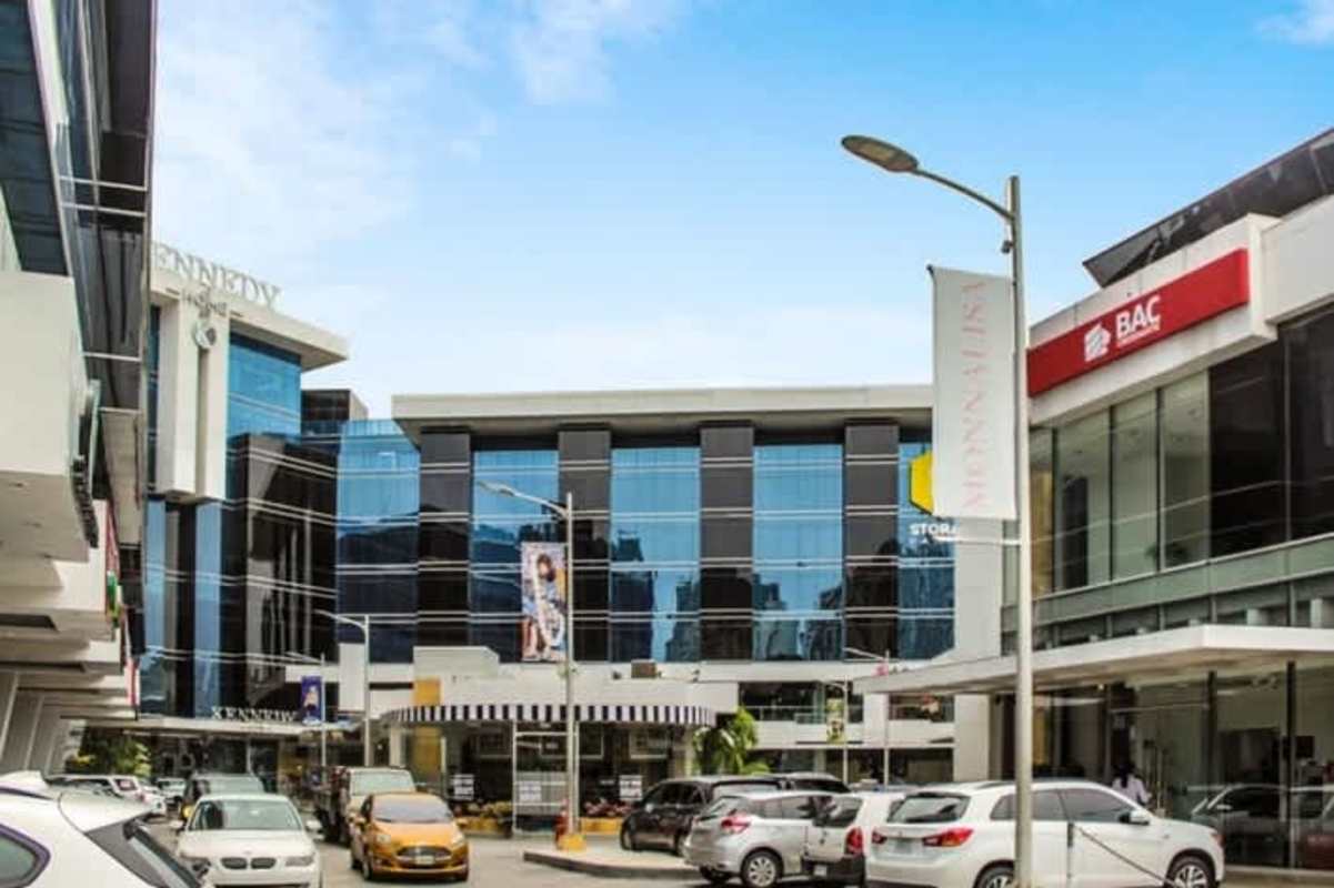 Contemporary commercial complex with glass facade, parking area, greenery in San Francisco Panama
