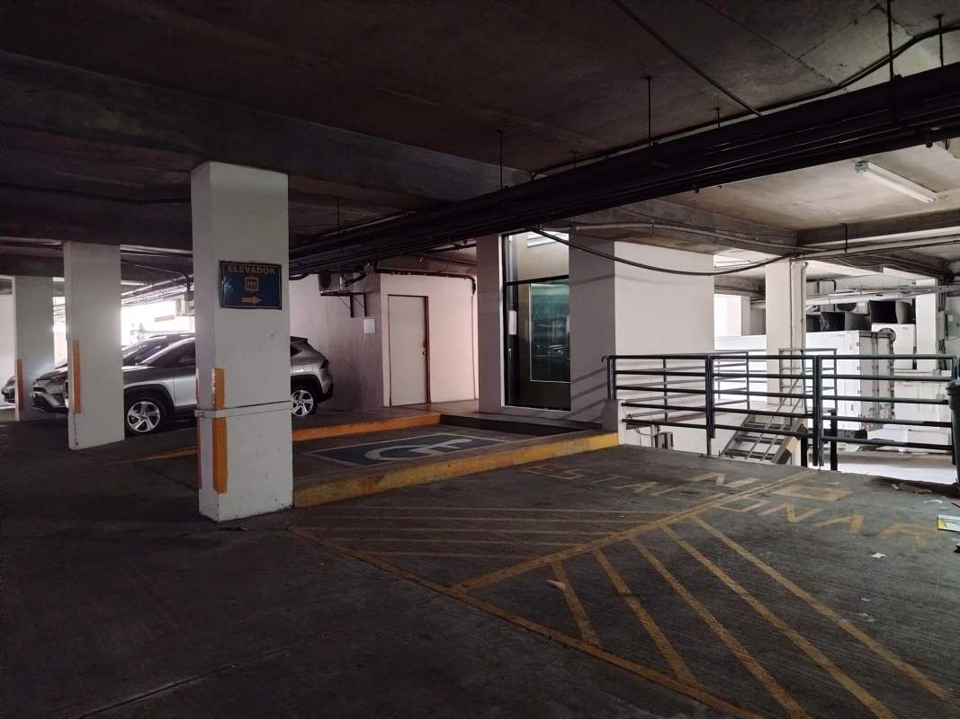Indoor parking garage with handicap parking, elevator sign, metal railing in Plaza El Cohete near Universidad Tecnológica Panama City