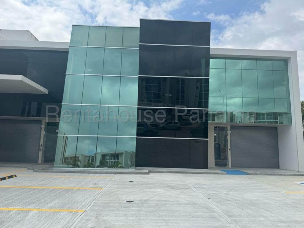Exterior: Modern industrial facade with glass windows, roller shutter door, and multiple parking spaces in Panama Viejo.