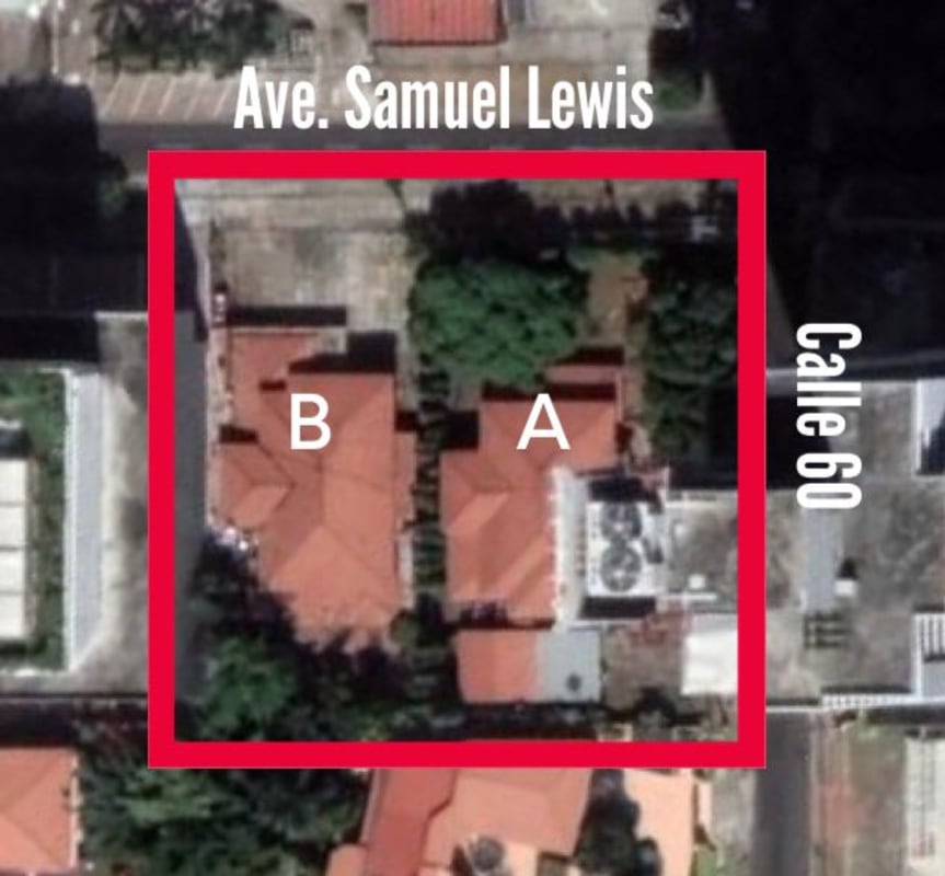 Aerial image showing corner lot with red boundary and two Mediterranean style buildings on Ave Samuel Lewis and Calle 60 in Obarrio Panama City