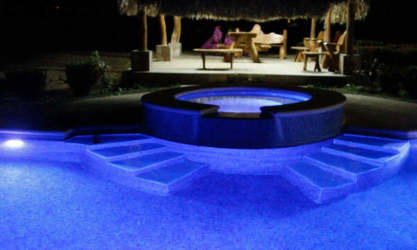 Spacious outdoor pool with attached jacuzzi area and night lighting.