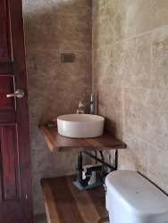 Rustic bathroom with beige stone tiles, vessel sink on wood countertop in countryside house Las Uvas Panama