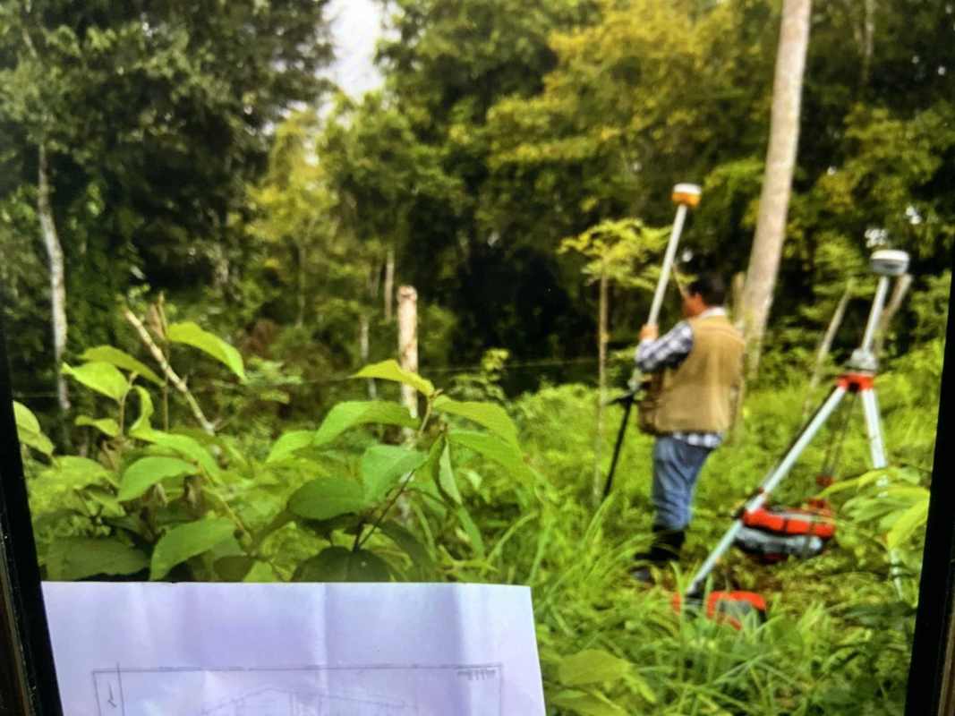 Land surveyor with GPS tripod and plans on wooded lot for sale Las Cumbres Panama