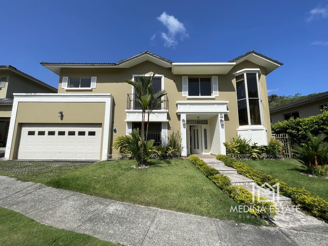 Beautiful two-story single-family residence in prestigious Embassy Gardens, Clayton. Featuring 330 m² construction on a 430 m² lot, this home boasts 3 spacious bedrooms each with en-suite bathrooms, a large master with walk-in closet, family lounge upstairs, plus service quarters and 4.5 baths total. The ground floor offers expansive living & dining rooms, guest half bath, dedicated den, modern kitchen with granite countertops and breakfast nook, laundry, maid's room, enclosed two-car garage and 2 additional outdoor parking. Relax on your generous covered terrace surrounded by lush gardens ideal for pets and children. Includes 7 Inverter ACs, new stove, refrigerator, washer, dryer, gas water heater and storage. Embassy Gardens is a gated diplomatic community with playgrounds, tennis courts, basketball, walking paths, 24/7 security and over 3,000 m² of green recreation park. Close to the U.S. Embassy, Ciudad del Saber, top schools, Albrook Mall & airport connections. Low HOA $300/m. Priced at $620,000 with recent 5% discount. Quality living in a secure natural environment for families or investment.