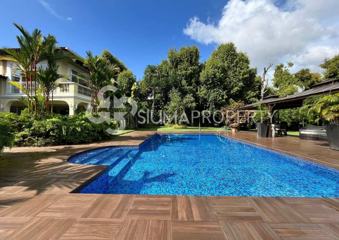 Spacious outdoor pool with sun deck and garden views.