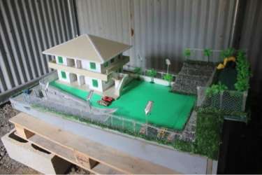 Miniature housing project model with two-story house, garden, driveway, and playground in Puerto Pilón Colón