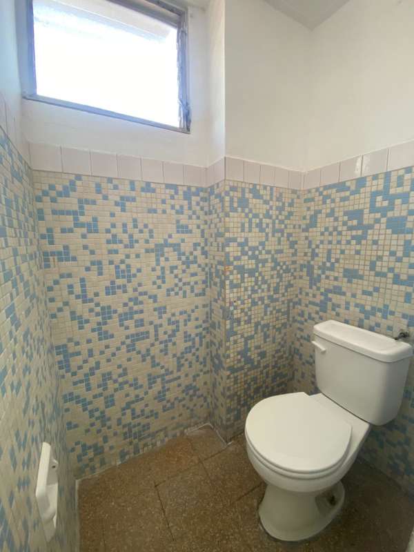 Compact bathroom with mosaic tiles, white toilet, frosted window in Edificio Dolores Panama City