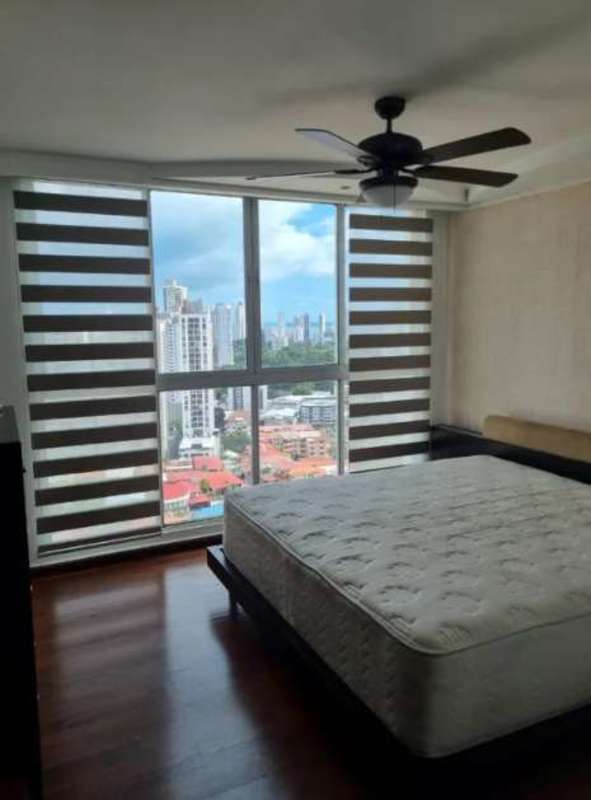 Modern bedroom featuring large window, striped blinds, ceiling fan and city view at PH Park Lane Tower Panama City