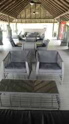 Rustic tropical lounge area with thatched roof and modern patio furniture at Coronado Beach