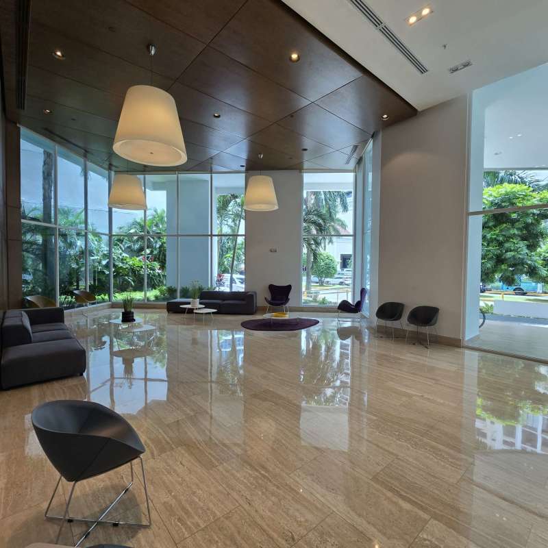 Spacious lobby with marble floors, modern furniture and floor-to-ceiling windows PH Castellammare Costa del Este Panama
