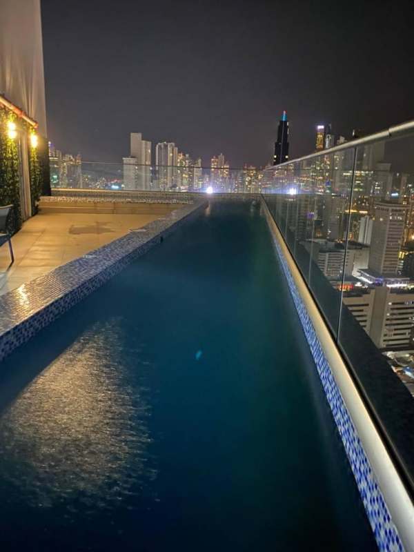 Night view rooftop pool with illuminated skyline from PH Cranc Tower El Cangrejo Panama City