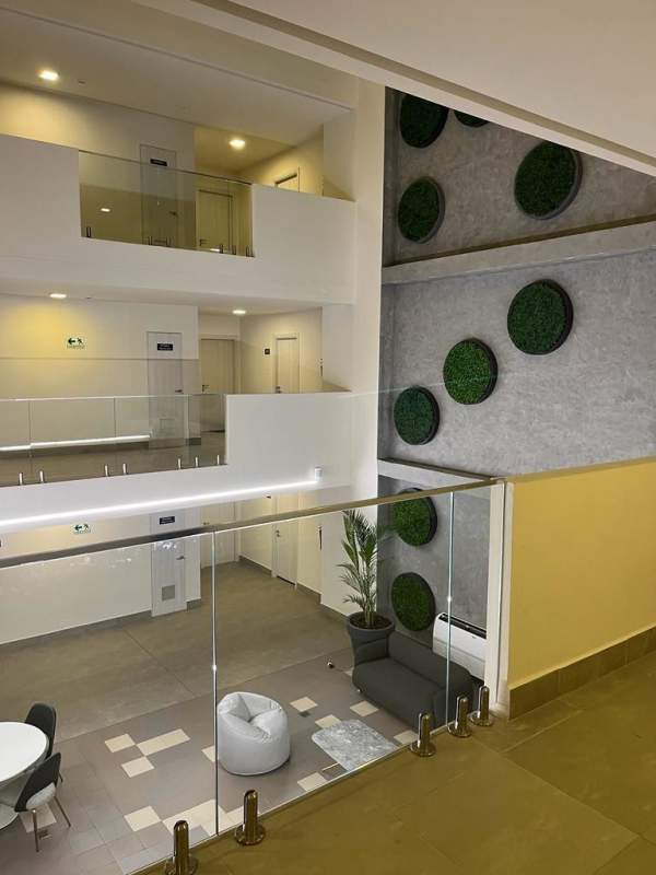 Elegant lobby of PH Pacific Coast Tower with designer seating and glass accents in Coco del Mar Panama