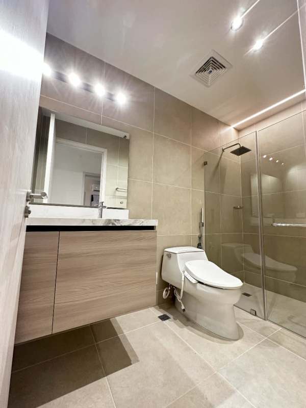 Modern bathroom with glass shower, vanity, neutral tiles in Santa Maria rental apartment