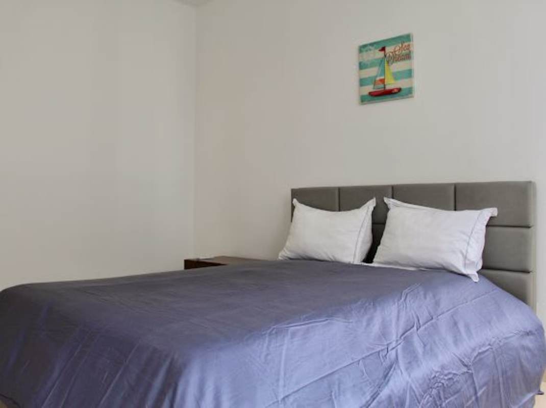 Minimalist bedroom with nautical wall art, gray headboard and blue bedding in Punta Pacifica Panama