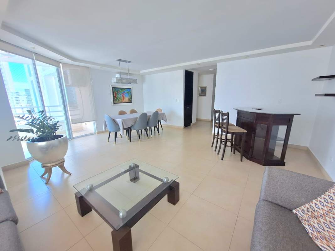 Open dining and living room with large windows and terrace access fully furnished in PH San Francisco Bay Panama City