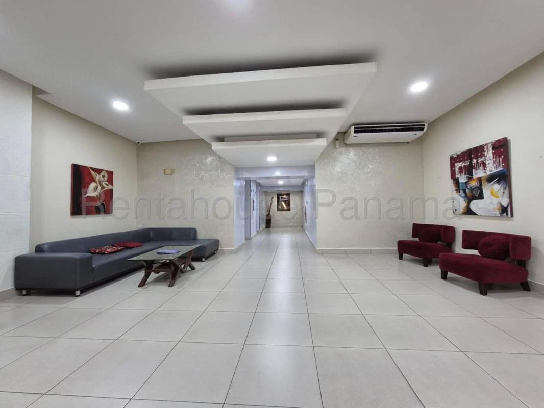 Modern lobby with gray sofa, red chairs, accent lighting at PH Pacific Sun Punta Pacifica Panama City