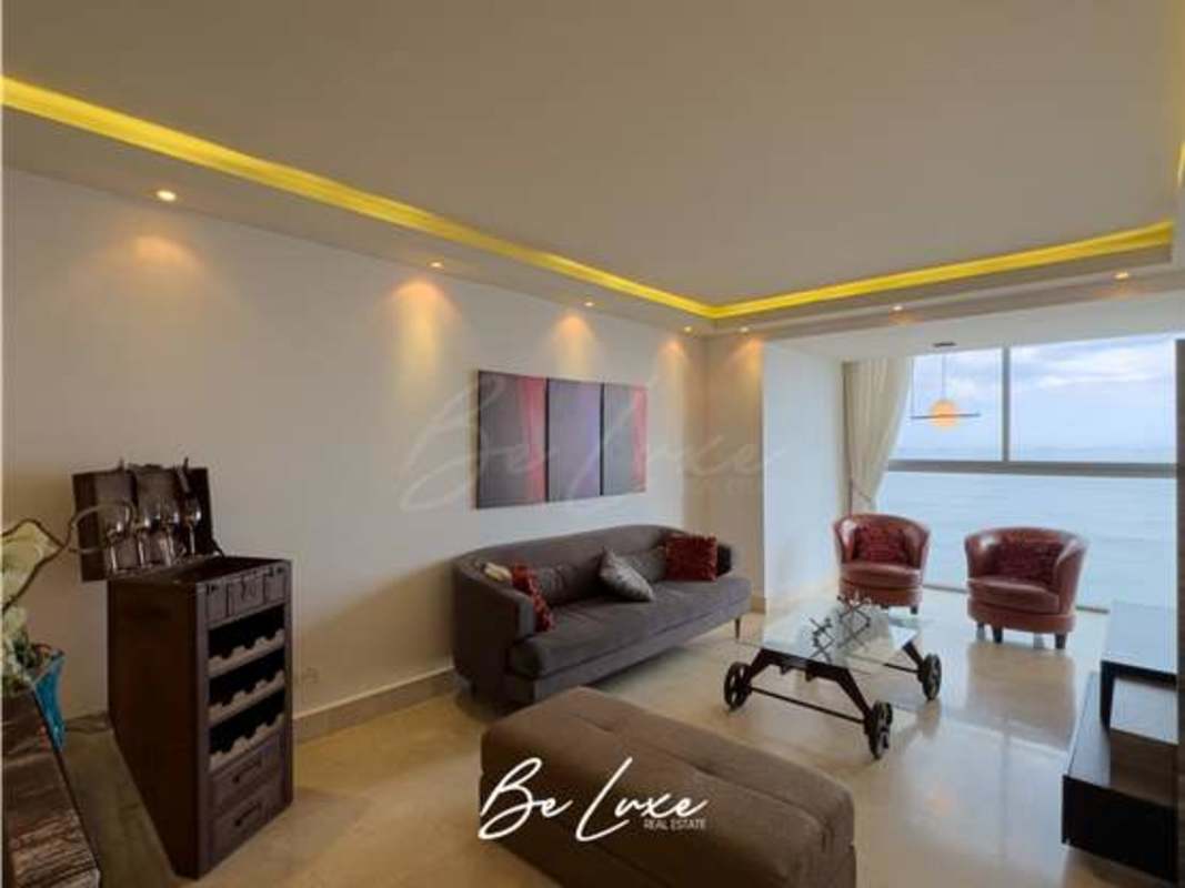 Furnished modern living room with panoramic ocean views, marble floors and contemporary decor at PH Yoo in Avenida Balboa Panama City