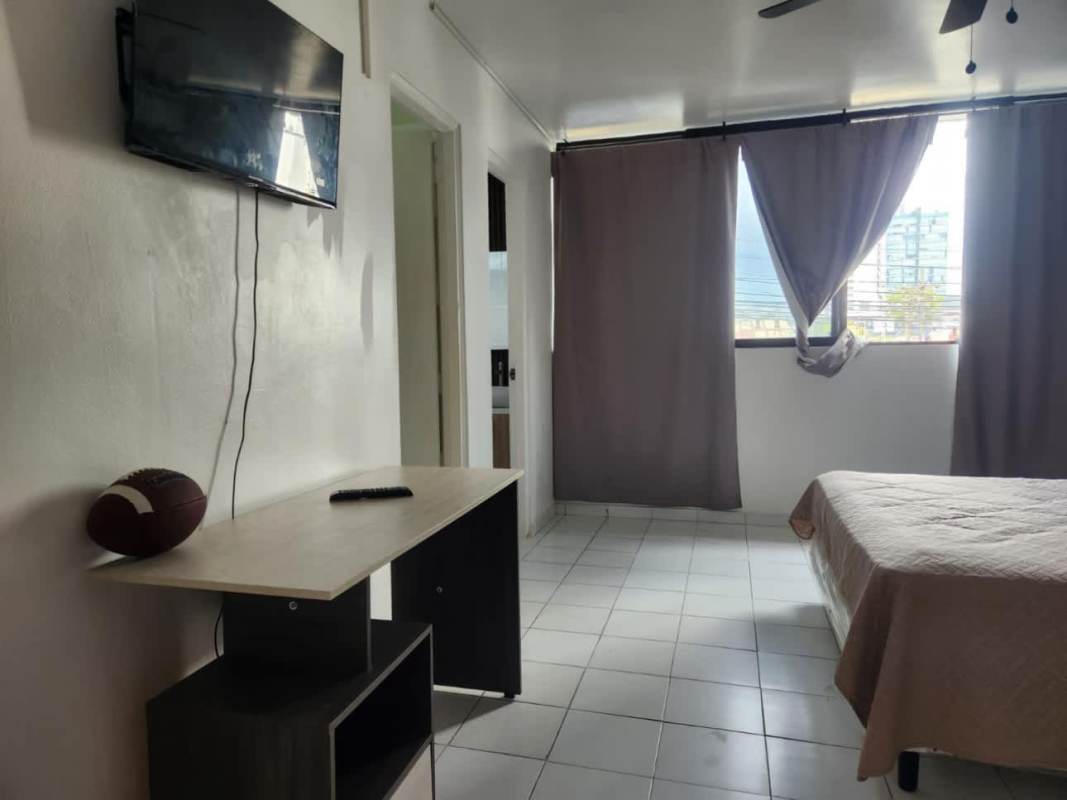 Comes furnished: bed, TV, desk, closet.