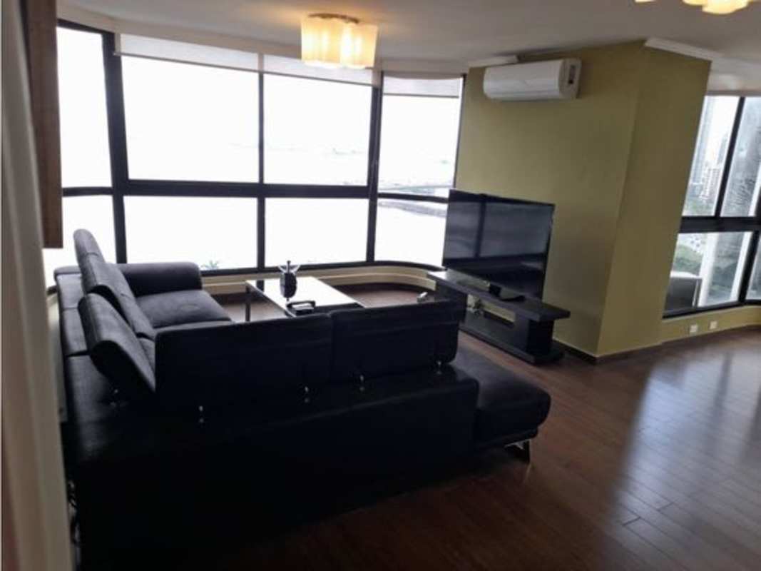 Furnished living room with panoramic ocean and skyline view in PH Coral Reef on Avenida Balboa Panama City