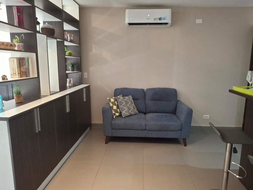 Minimalist living area with built-in shelves, blue loveseat, AC and bar counter at PH Colores de Bella Vista Panama City