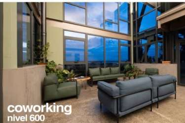 Coworking lounge with floor to ceiling windows, city views, and vibrant seating at PH Casco Views Casco Antiguo Panama