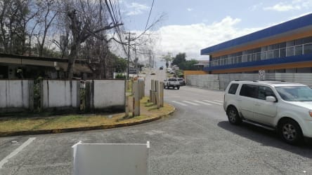 Urban corner location with commercial building, fence, white SUV and signage near El Dorado Panama City