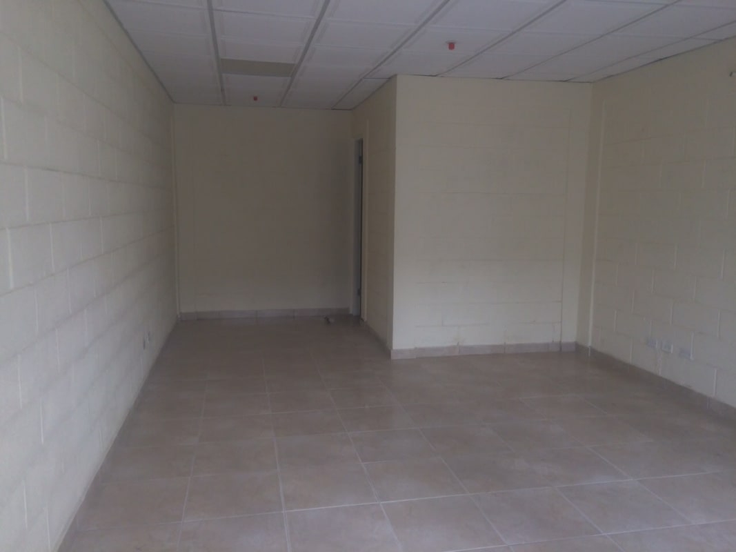 Empty room inside commercial warehouse with tiled floors and drop ceiling, suitable for office or storage Panama