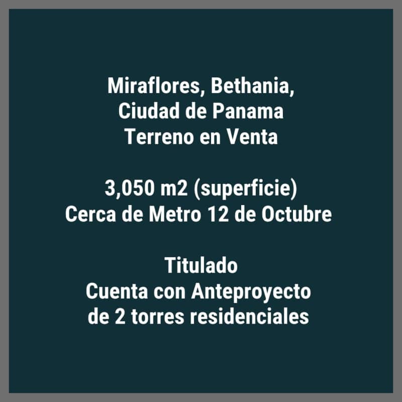Excellent development opportunity in Miraflores, Betania, Panama City. This titled 3,050 m² lot is ideally located just 400 meters from Metro 12 de Octubre, on a central corridor with easy connection to Via Transistmica. Features a preliminary project proposal for two residential towers, making it perfect for construction of apartments or a mixed-use complex. The property boasts urban zoning, flat topography, access to electricity, water, and sewer networks. Surrounding area combines residential and commercial properties, offering high demand potential. Secure this well-located lot for $2,000,000 ($655/m²), ideal for investors or developers seeking prime land in a growing transit-oriented neighborhood. Contact Casa Nova Realty Panama Panama for more details and site visits.