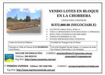Development opportunity: block of 6 residential lots, each 158 m², in Urbanization Puerto Caimito, La Chorrera, Panama Oeste. Fully approved infrastructure and permits, ready for immediate construction. Ideal for single-family homes or investment project. Paved road access, utilities connection-ready. Located minutes from Panamerican Highway, La Chorrera center, beaches, shopping, and future growth areas. Total 948 m², asking $272,000 negotiable (only ~$287/m²). Secure your project in a high-demand expanding zone. Contact Casa Nova Realty Panama to develop or invest today.